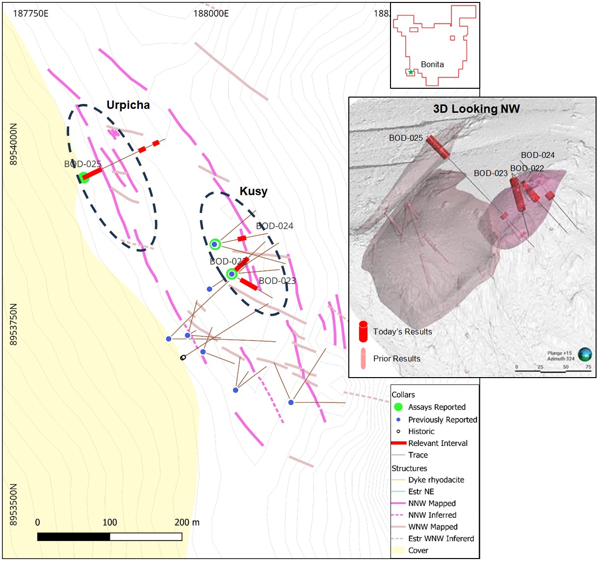 - The Urpicha discovery confirms the potential of the Bonita vein system to host strong mineralization near surface to the northwest of prior drilling where multiple parallel structures remain to be tested and the zone remains open along strike