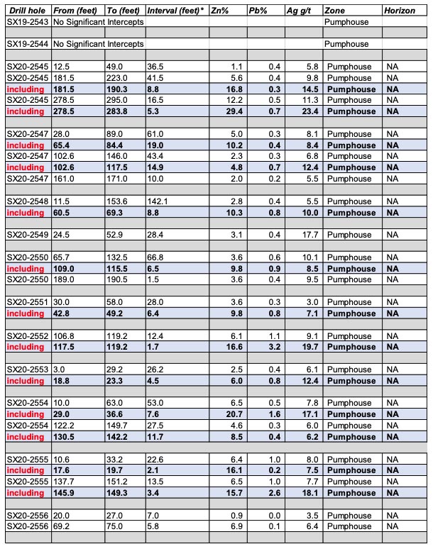 - Pumphouse Zone: Drilling has defined a zone of mineralization 25 feet thick over a strike length of 300 feet extending to a depth of at least 150 feet with hole SX20-2554 returning 53.0 feet assaying 6.5% zinc, 0.5% lead and 7.8 g/t silver, including 7.6 feet assaying 20.7% zinc, 1.6% lead and 17.1 g/t silver.