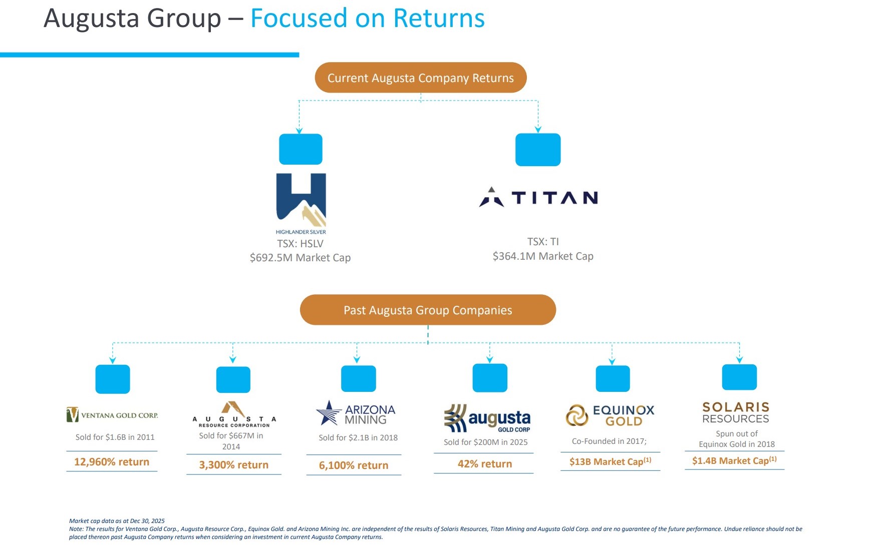 Note: The results for Ventana Gold Corp., Augusta Resource Corp., Equinox Gold. and Arizona Mining Inc. are independent of the results of Solaris Resources, Titan Mining and Augusta Gold Corp. and are no guarantee of the future performance. Undue reliance should not be placed thereon past Augusta Company returns when considering an investment in current Augusta Company return.